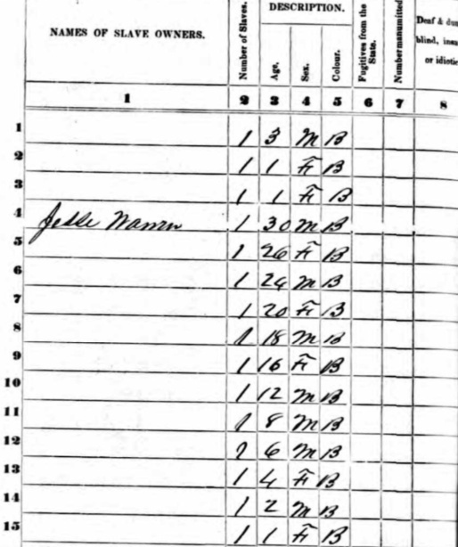 Notice the demographic makeup of the nameless enslaved people in the 1850 Federal Slave Schedule from Macon County looked like at least one or more family units (men, women, and children):